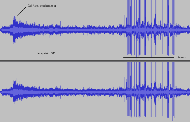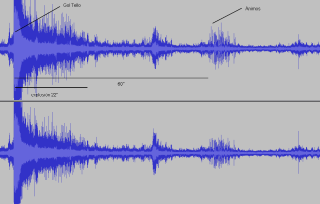[ESP] Ayer tuve la suerte de asistir al primer partido de Champions del FC Barcelona. Grabé las dos partes enteras, con las reacciones de 74.000 personas en cinco goles, una lesión, decisiones arbritales … un auténtico circo sonoro. Leer la forma de onda de las reacciones del público te enseña el timing de ilusiones, decepciones y ánimos que van surgiendo. Por ejemplo, aquí el primer gol de Tello en el minuto 13.