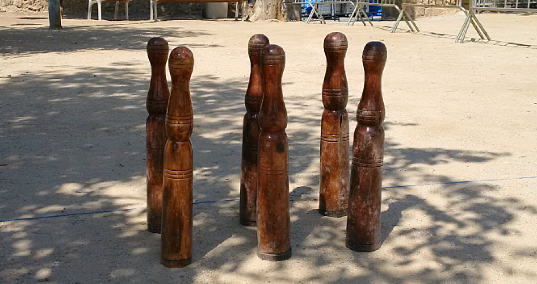 [ENG] Les «bitlles catalanes» is a traditional Catalan sport that has characteristic elements: six bowling pins and three clubs. The latter are the pieces that players throw to try to «make a pin.» The conversations between the players accompany the powerful sound of the wood, which in this case has been recorded in the Festival of Sant Cugat del Vallès.