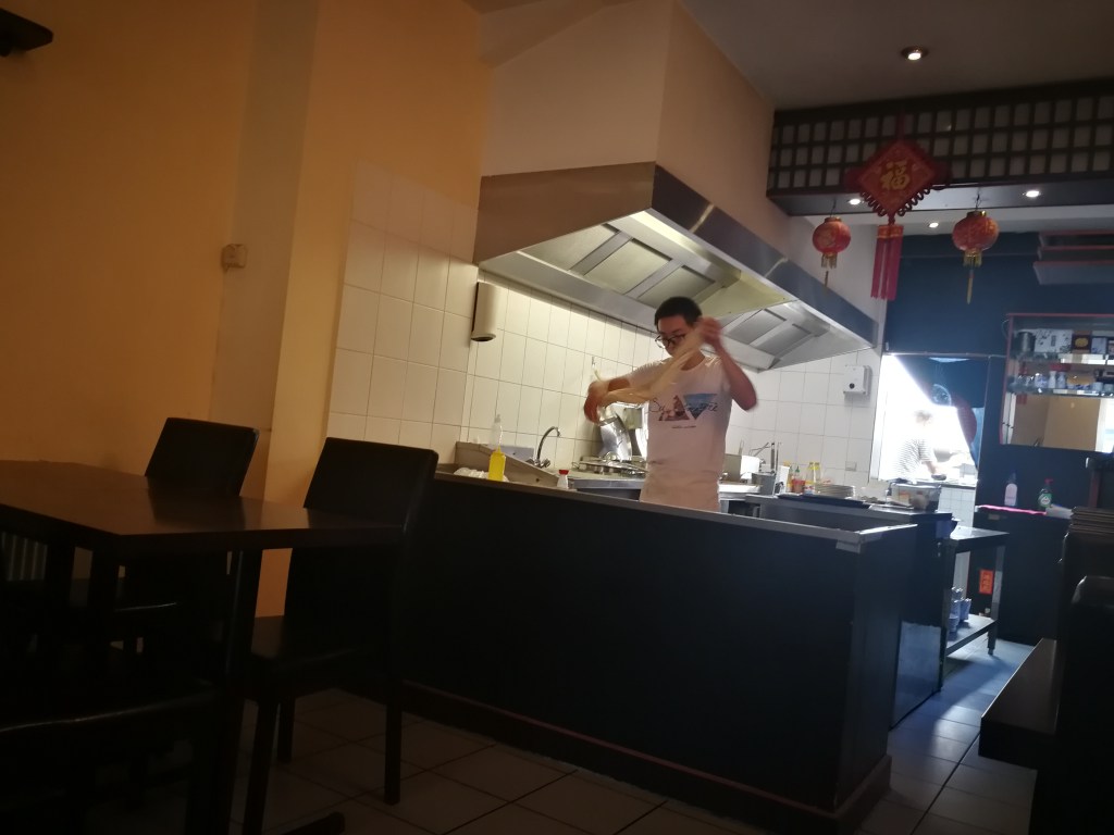 [CAT] A Anvers es troba l’únic barri xinès de Bèlgica on podem menjar en uns quants restaurants interessants on fan la massa i les fideus a mà i, a més, al moment. Es poden escoltar els cops a la taula metàl·lica mentre els clients (tots asiàtics) parlen i mengen a les seves taules. El moviments del cuiner és precís com un rellotge ja que mentre fa la massa, cuida ell sol de tot el menjar que s’està fent al foc.