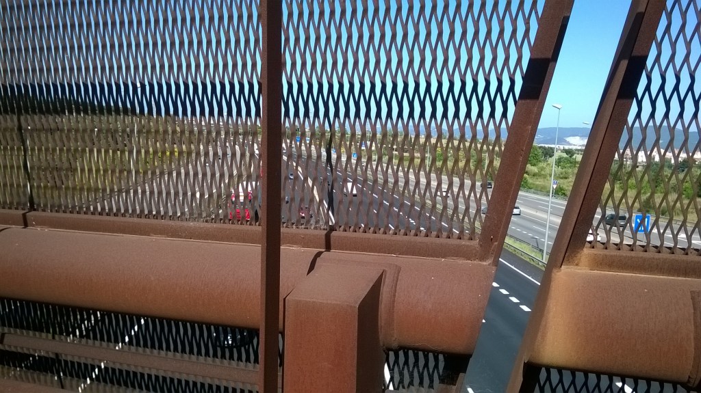 [CAT] Els ponts aguanten una pressió immensa i a més també transformen el soroll en vibració. Aquest pont travessa l’autopista, està a Bellaterra i és el que porta al sud de la Universitat Autònoma de Barcelona. Està feta totalment de ferro i contínuament vibra al pas dels cotxes. Al principi de l’àudio es poden escoltar amb normalitat els cotxes i en el segon 30 el so es converteix exactament com si poséssim l’orella en el fred metall.