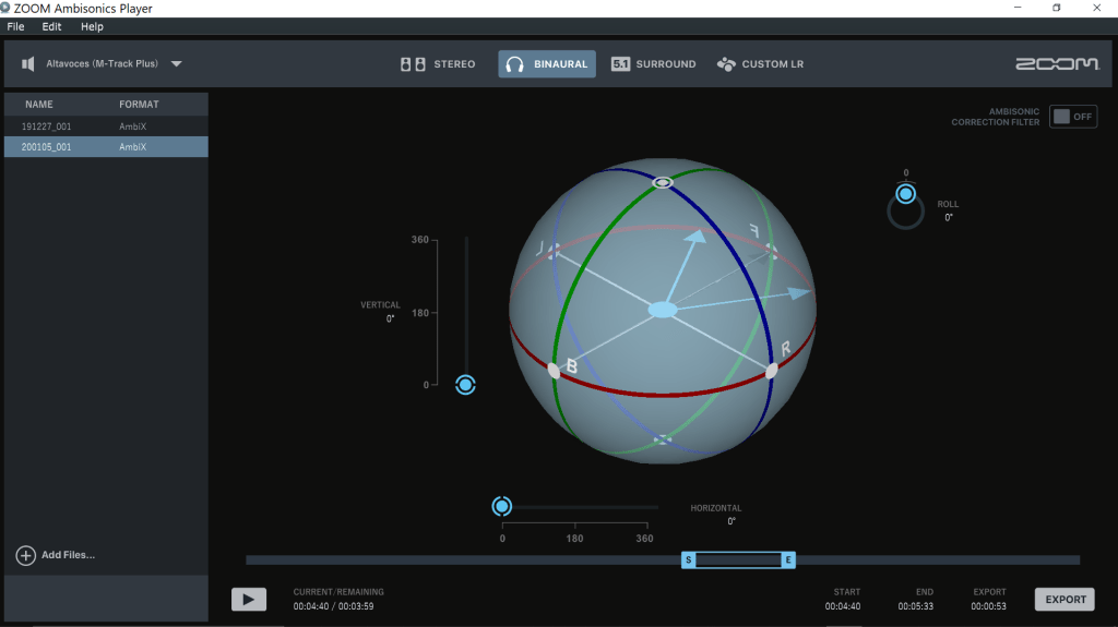 La mezcla se puede hacer desde el software que viene con el micrófono y que se llama Zoom Ambisonics Player donde puedes cambiar las perspectivas en los 360 grados y en horizontal y vertical, tal como si movieras tu cabeza en todas las direcciones posibles. Estoy trabajando en archivos de sonido y vídeo en 360º que espero traeros pronto para que podáis experimentar el sonido en su máxima expresión de libertad.