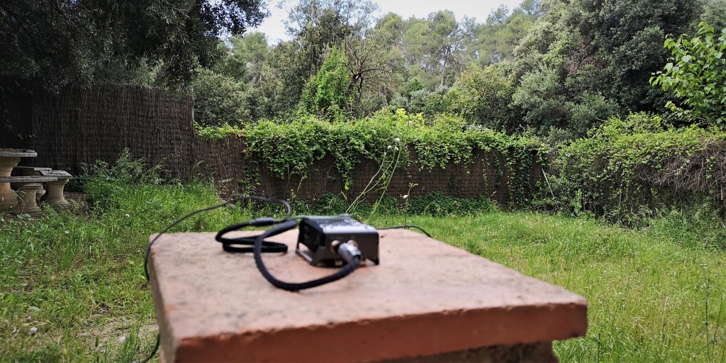 [CAT] En una zona tranquila de la casa d’uns amics que viu a La Floresta, vaig col·locar la gravadora amb dos micrófons omni-direccionals separats per una estructura de pedra. Això em permet poder diferenciar bé els canals esquerra i dret. La zona boscosa que tinc al davant és tranquil·la però a una decena de metres hi ha més cases i a més també s’escolten, de tant en tant, les motos que passen per la carretera. De totes formes, els ocells estan tranquils i el seu so es mescla amb el moviment de les fulles i les branques dels arbres