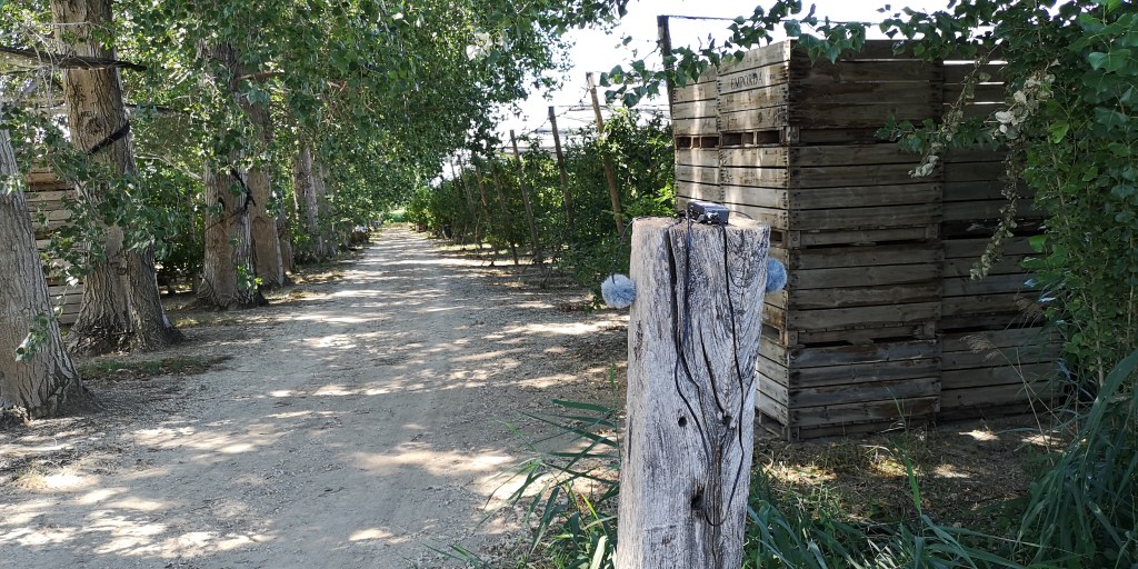 [CAT] Uns arbres gegantins calmen la Tramuntana en una zona amb pomeres a l’Alt Empordà, una comarca que toca amb França a Girona. Les fulles d’aquests arbres canvien l’energia del vent en moviment per la del so, que és molt similar a la remor de les onades de la mar. Els grinyols dels grills no desapareixen en cap moment mentre el vent va i ve i l’ocell va cantant de fons.