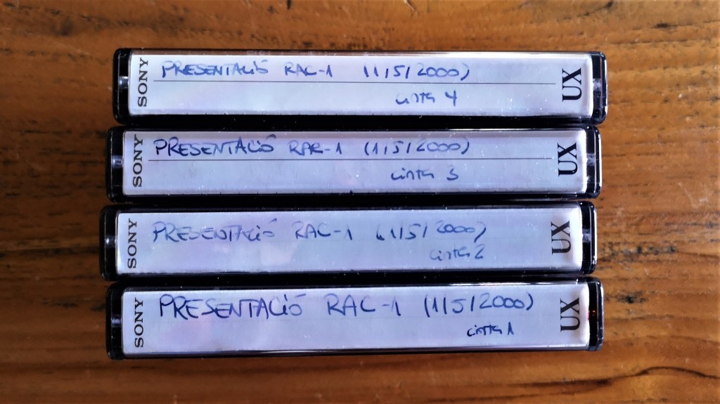 El dia 1 de maig del 2000 vaig enregistrar aquestes quatre cintes de 90′ amb el primer dia de programació de l’emissora privada Rac1. L’emissió inaugural o els sis programes zero s’anaven repetint en bucle durant tot el dia.