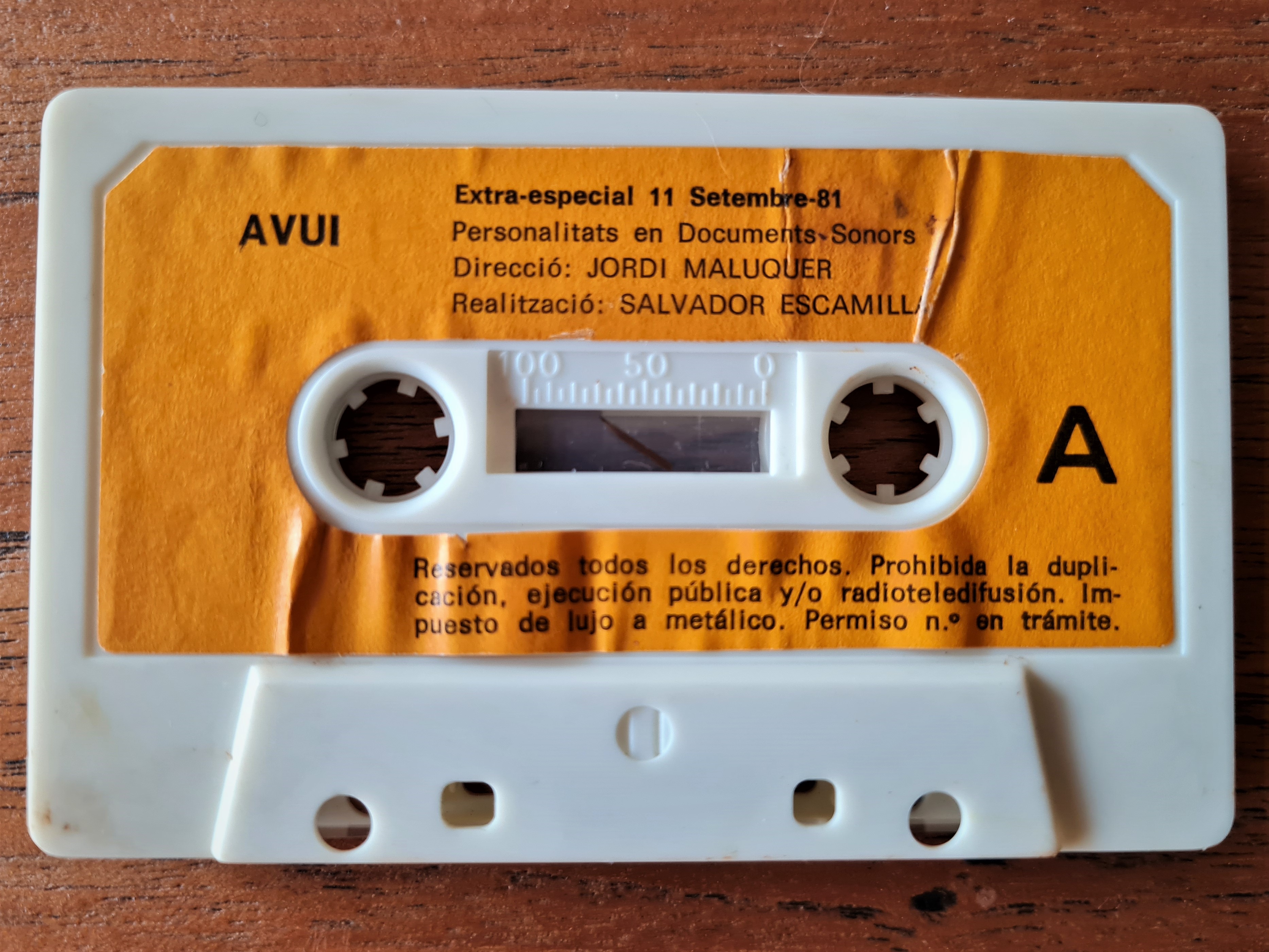 Aquesta cinta de casset segurament venia amb una edició especial del diari Avui de l’11 de Setembre de 1981. Una cinta amb 15 minuts per cara amb una sèrie de personalitats que son presentades per Salvador Escamilla en un document sonor dirigit pel catedràtic Jordi Maluquer.