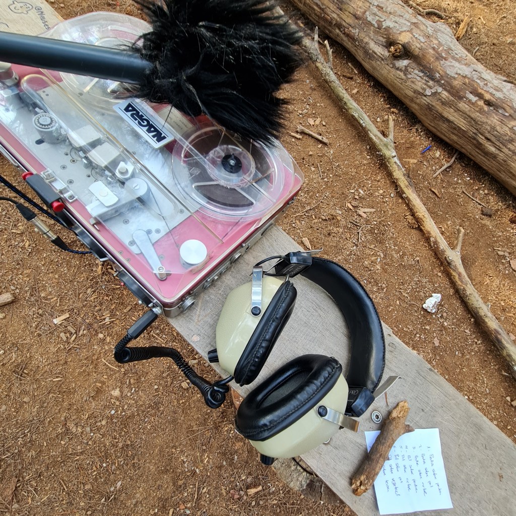 [CAT] He fet una peça sonora amb tecnologia dels anys setanta i vuitanta. Una gravadora NAGRA, uns auriculars japonesos monoraurals i un micròfon Sennheiser. Tota la mescla és monoaural perquè el NAGRA és un magnetòfon de bobina oberta que enregistra analògicament «full track» en una pista. He enregistrat al camp pedra sobre pedra, pedra sobre pal, pedra sobre arbre, pal sobre pedra, pal sobre arbre, pal sobre pal, pal sobre vegetació i mà sobre terra i he fet una mescla sonora digital. No hi ha més.