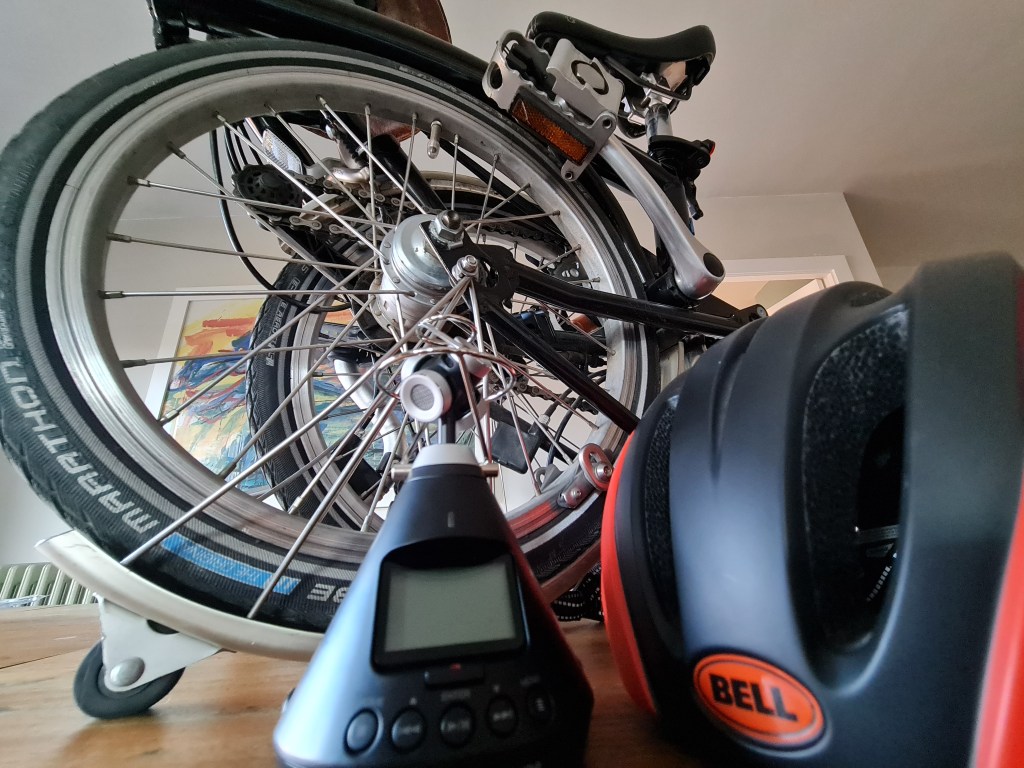 Bicicleta Brompton i una gravadora de so binaural