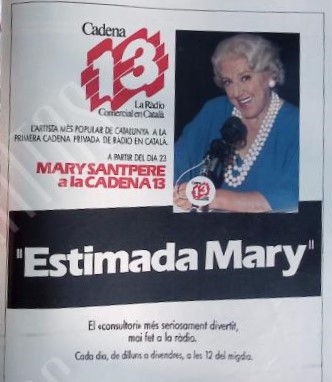 A mitjans de la dècada dels anys vuitanta Mary Santpere va col·laborar amb Cadena 13 per presentar «Estimada Mary«, el «consultori més seriosament divertit, mai fet a la ràdio» que s’allunyava de la popular «Elena Francis«.