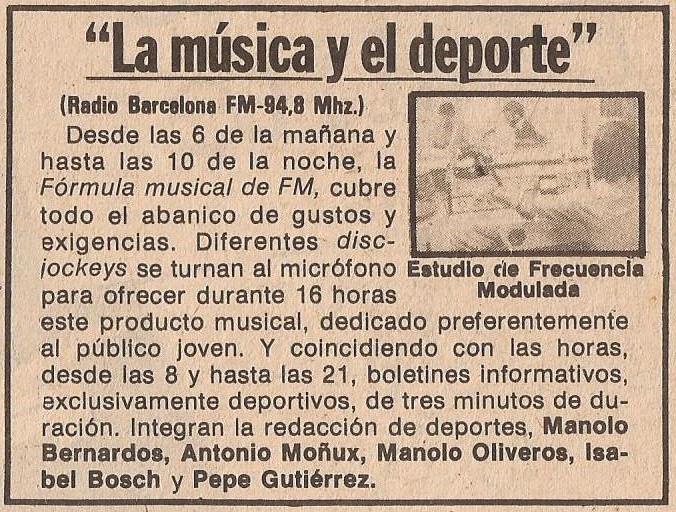 4) Se informa que el segundo canal de Radio Barcelona se constituyó en la primera emisora deportiva del país bajo el título de Radio Sport. Gracias a la amable aportación de Toni Mascaró, adjunto un recorte de El Periódico del 10/06/1981 sobre las características de esta Fórmula Musical.