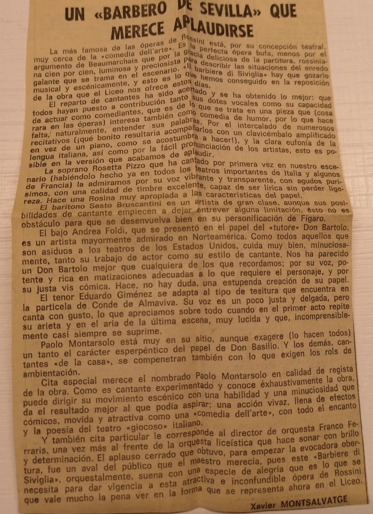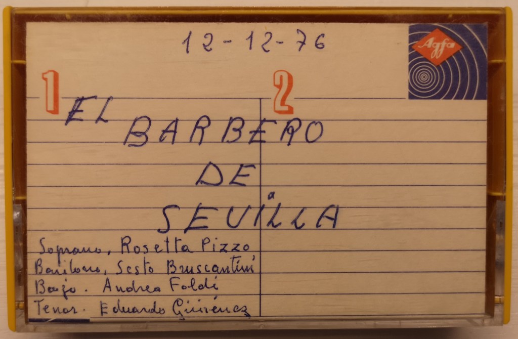 RNE | 12/12/1976 | Fragmento de la retransmisión de «Il barbiere di Siviglia» de Gioachino Rossini del Gran Teatre del Liceu de Barcelona. La información de la esta ópera concreta se encuentra en estos archivos del Liceu de Barcelona. Concrectamente el corte de audio es el final del segundo acto, los aplausos, conexión con el boletín informativo y finalmente hay un comentario del experto Dr. Colomer Pujol crítico y foniatra de Radio Nacional de España. En el informativo también se puede escuchar un mensaje de servicio de socorro de RNE. En relación al informativo emitido en diferido, se informa sobre el secuestro, el día anterior en su despacho en la Fundación Oriol, de Antonio María de Oriol y Urquijo. Dentro de la cinta se encuentra un artículo de Xavier Montsalvatge sobre esta obra. La cinta se grabó en esa época por Santiago Alsina.