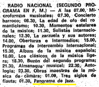 RNE | 1974 | Fragmento del programa «Panorama del Jazz» escrito y dirigido por Albert Mallofré. El programa se emitió por Radio Nacional de España durante los años 1974 y 1975. Como se observa en el corte de audio, el programa estaba locutado por un locutor profesional que decía «jezz».
